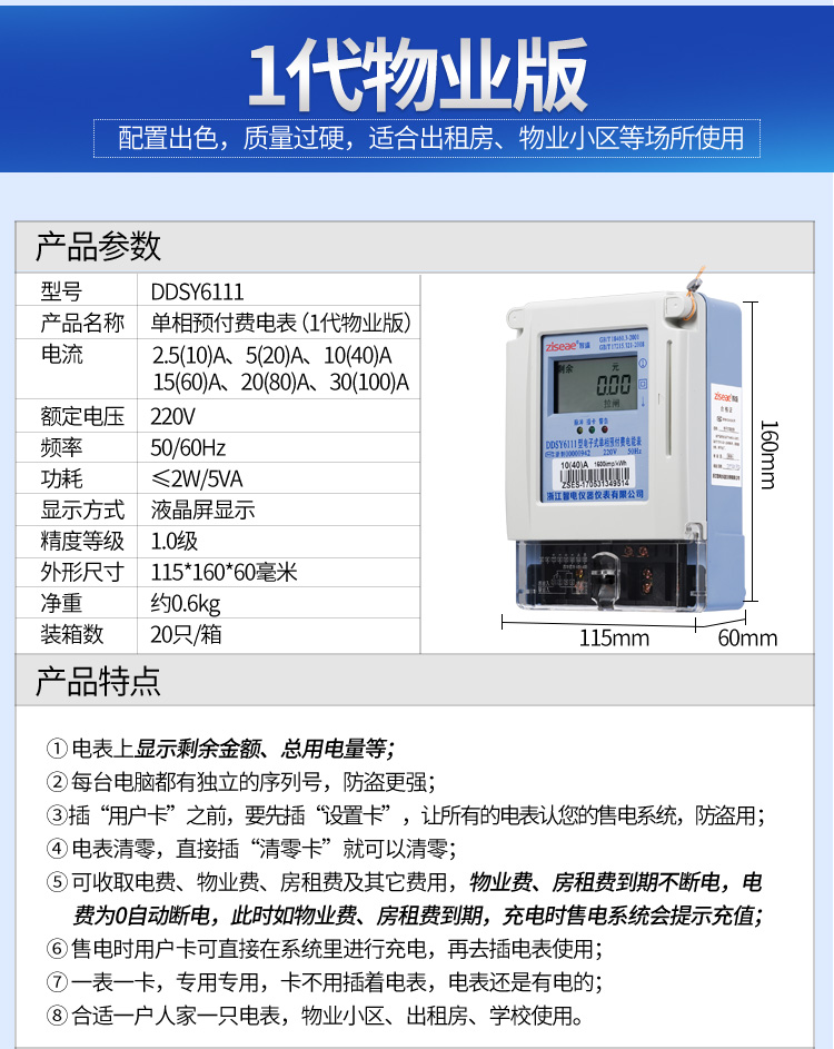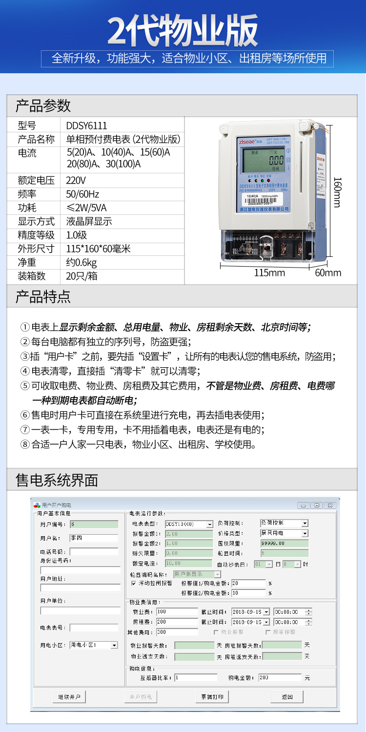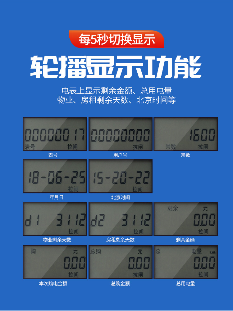 (2)預(yù)付費(fèi)電表的功能:經(jīng)典款電表是上顯示剩余電量、總用電量等,1代物業(yè)版電表上顯示剩余于金額、總用電量等,2代物業(yè)版電表上顯示剩余金額、總用電量、物業(yè)、房租剩余天數(shù)、北京時(shí)間等具體功能如下。